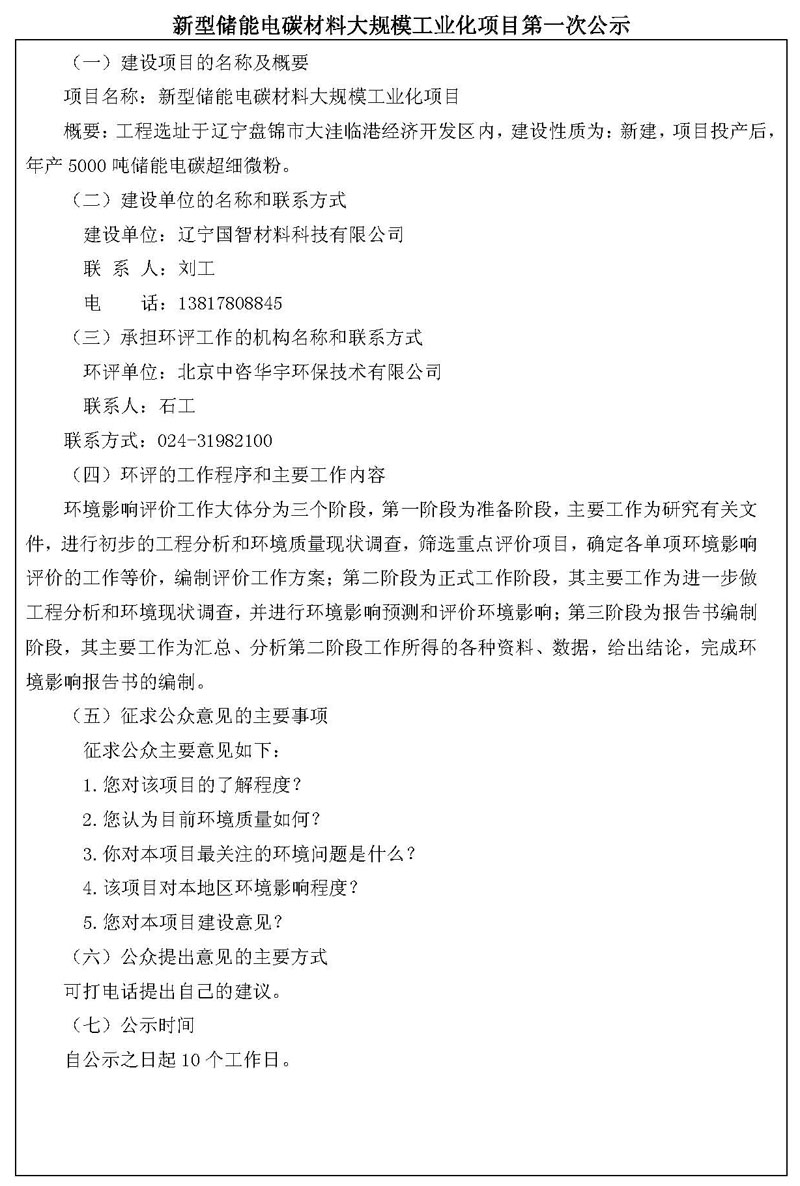 新型儲能電碳材料大規(guī)模工業(yè)化項目第 一次公示